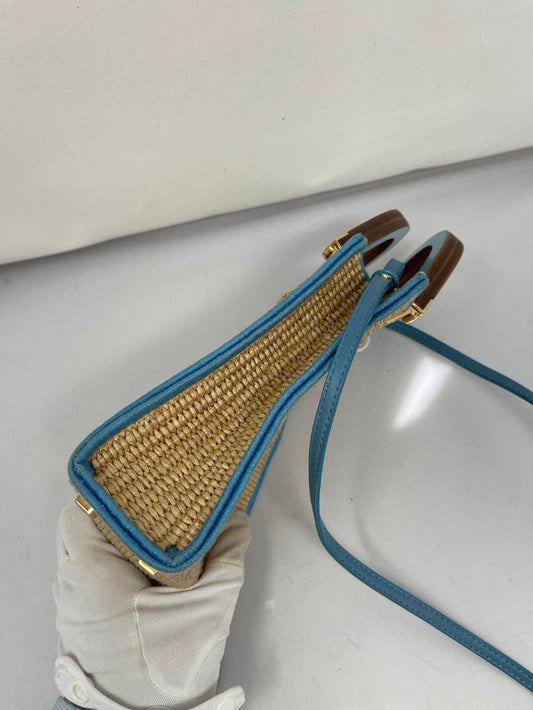 Fendi Blue Leather and Straw Sunshine Mini Crossbody Tote Bag