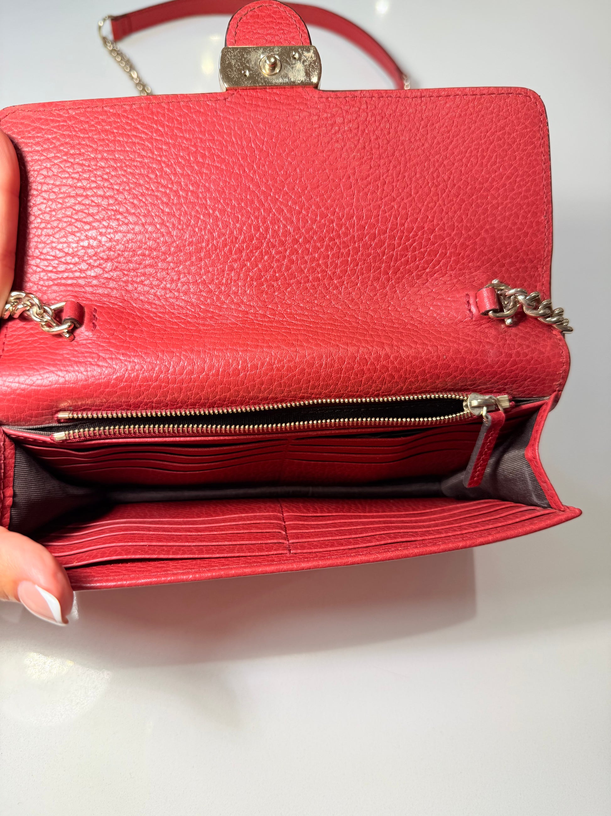 Gucci Interlocking Wallet on Chain blends function and style with detachable chain strap versatility.