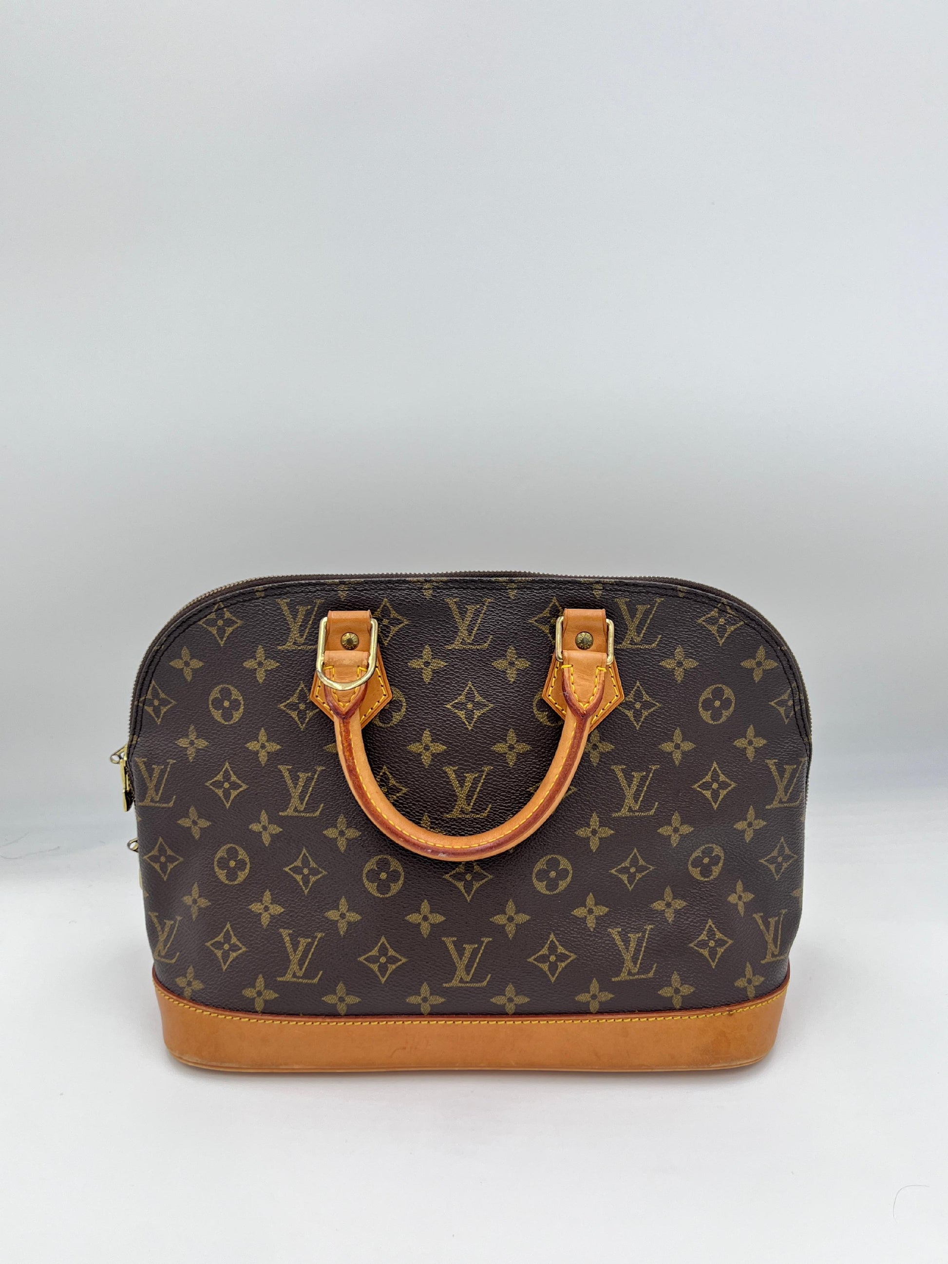 An iconic Louis Vuitton handbag in Epi leather, known for its structured dome shape and double zip closure. The Alma features rolled leather handles and a spacious interior, embodying Parisian chic and timeless craftsmanship.