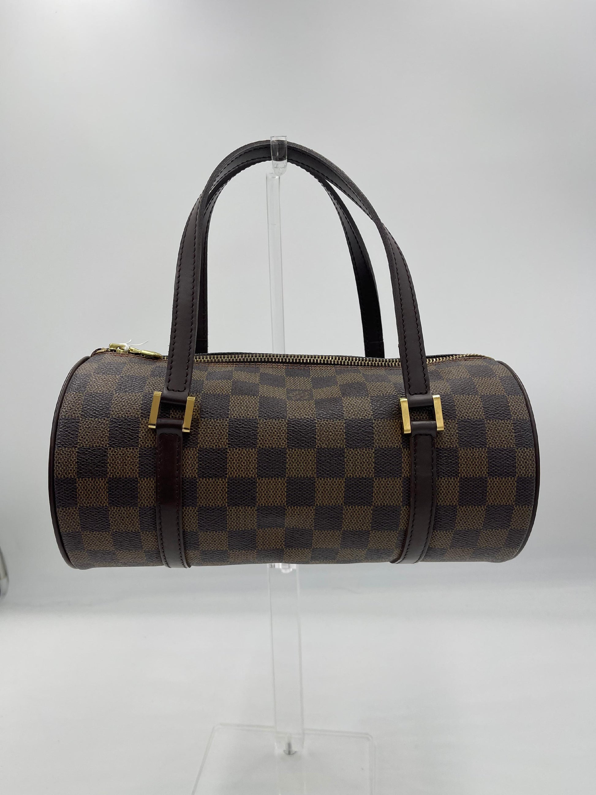 A classic cylindrical handbag in Damier Ebene canvas with leather handles and trim. The Papillon Damier is a modern twist on a vintage silhouette, offering both charm and versatility.