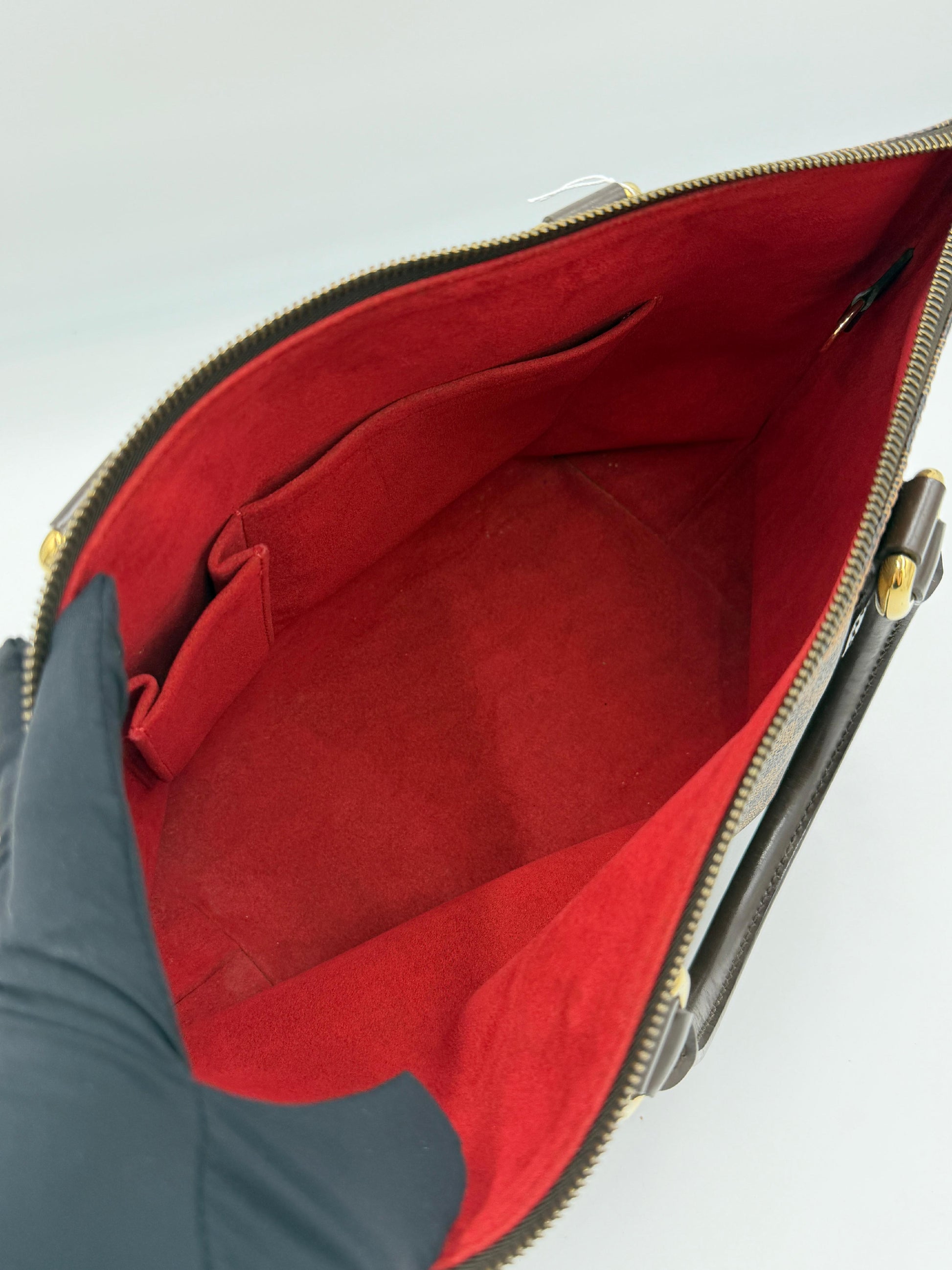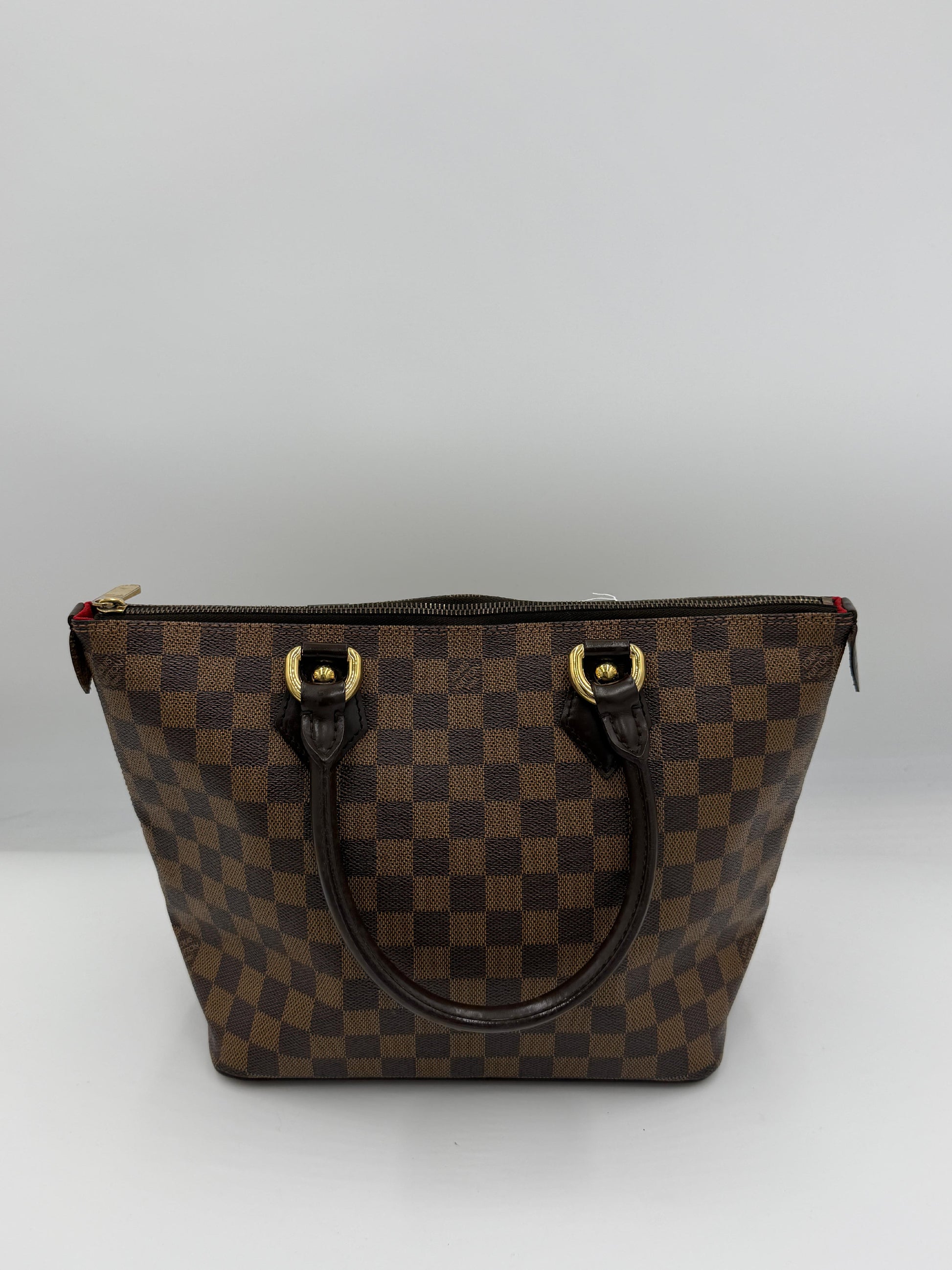 A sophisticated tote crafted from Damier Ebene canvas with gold-tone hardware. The Sareya features a secure zip closure, interior pockets, and a refined silhouette that transitions effortlessly from day to evening.