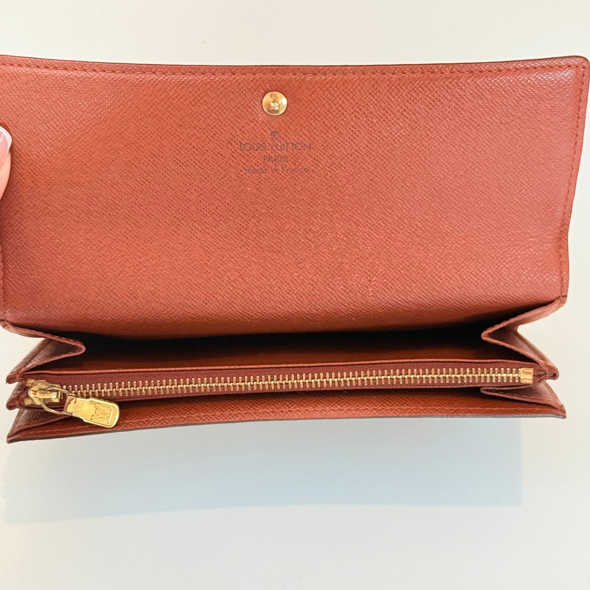 Elegant Louis Vuitton Portefuille Sarah wallet with an envelope-style flap and organized interior.