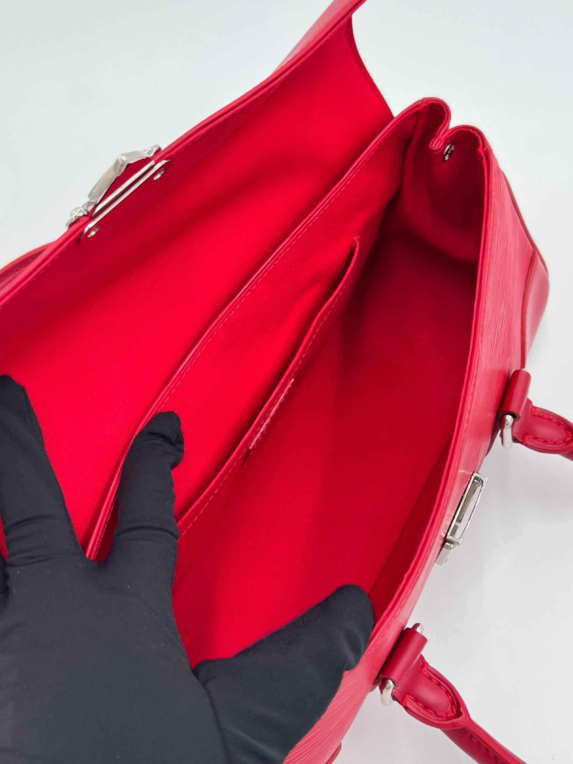 The Louis Vuitton Segur Epi PM bag showcases structured Epi leather, silver-tone hardware, and a secure flap closure. A refined choice for modern sophistication.