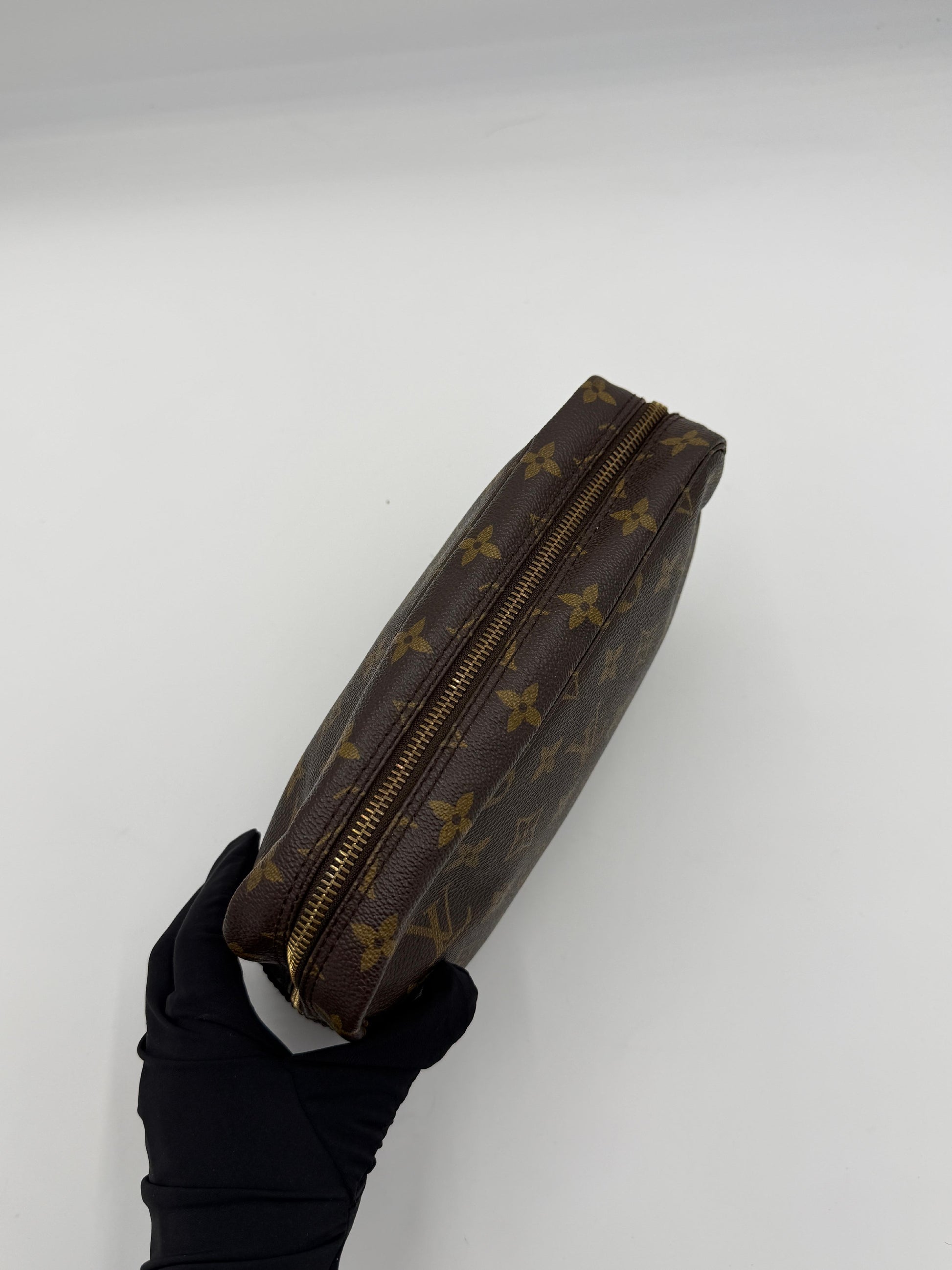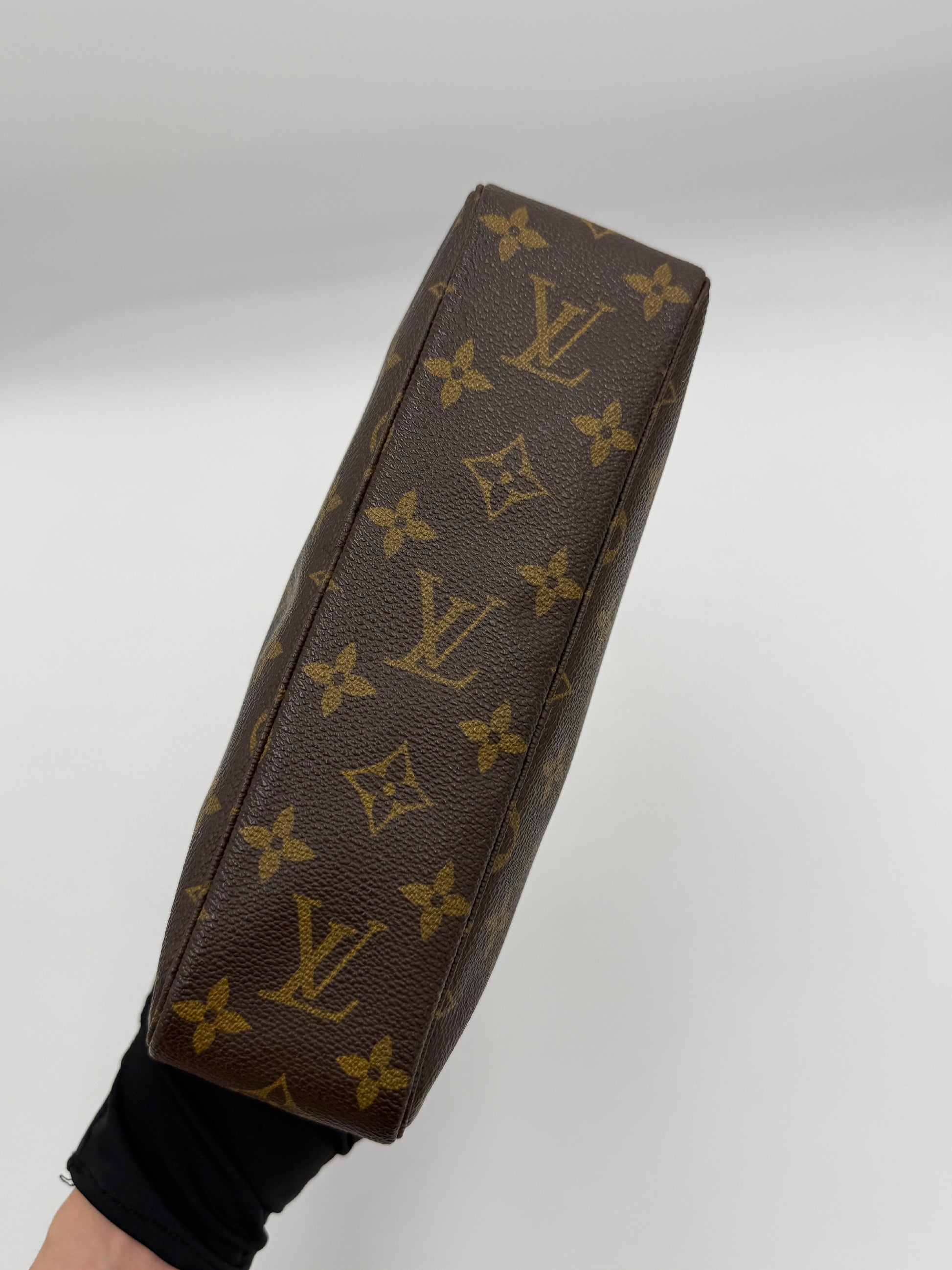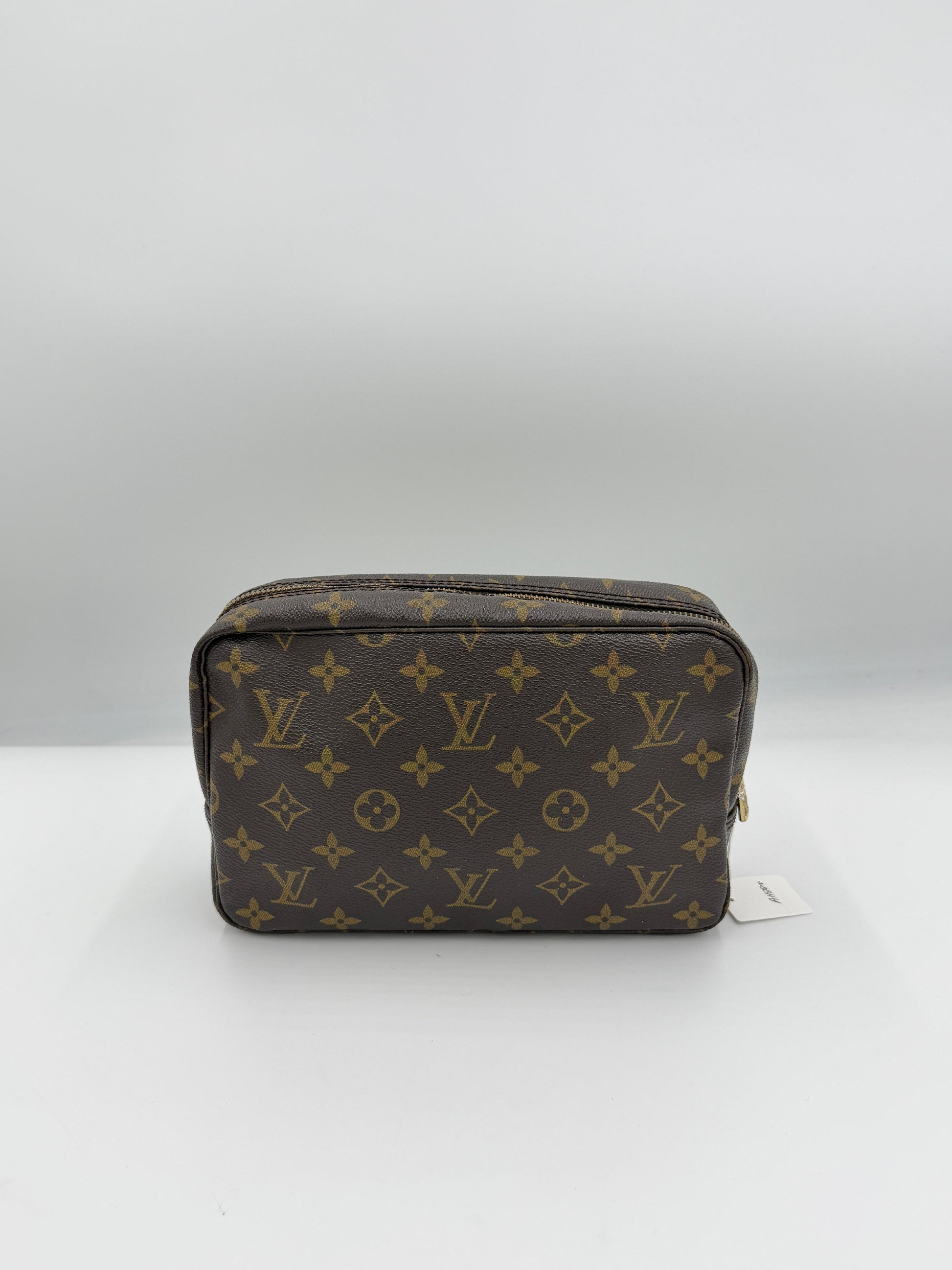 This Louis Vuitton Toulouse Toilette 25 is an elegant travel companion. Made from durable coated canvas with leather accents, it offers ample space for toiletries and travel essentials. A chic choice for any journey.