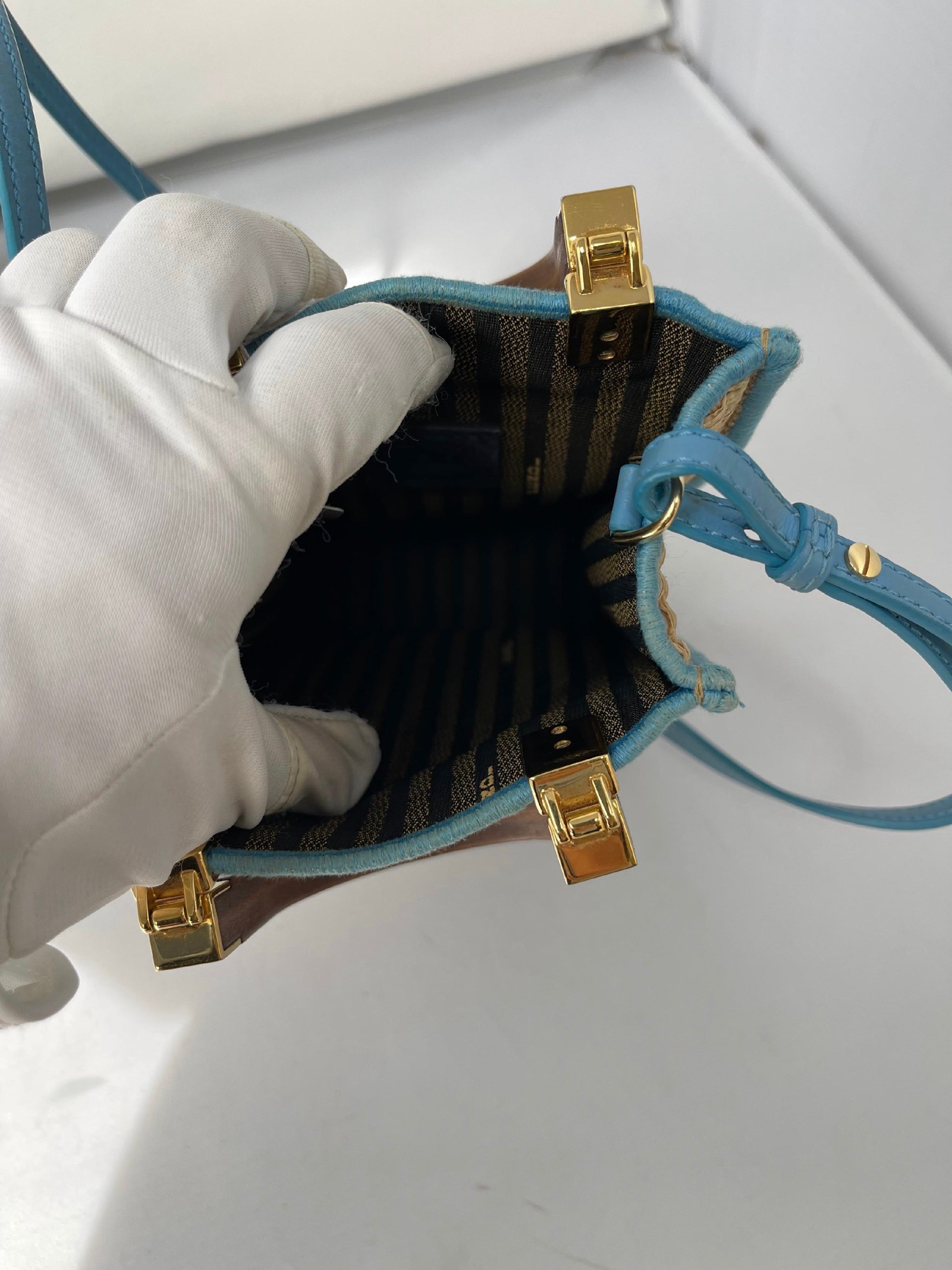 Fendi Blue Leather and Straw Sunshine Mini Crossbody Tote Bag